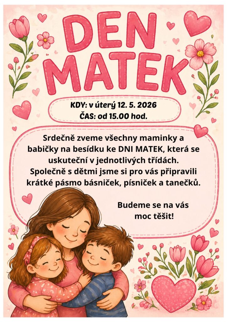 rádi bychom vás pozvali na společnou akci Úklid zahrady, která se uskuteční v rámci oslavy Dne Země. Prosíme vás o zapsání do připravené tabulky podle toho, jakou činnost byste chtěli během akce vykonávat. Zároveň vás prosíme, abyste si s sebou přinesli vhodné nářadí dle zvolené činnosti. Akce bude zakončena opékáním špekáčků. V případě nepříznivého počasí se akce přesune.