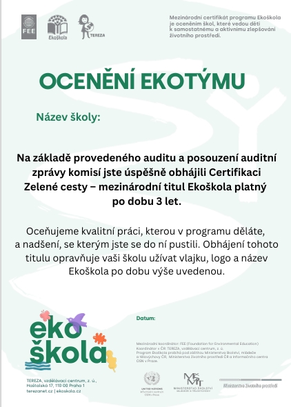 Při jídle, jehož vysokou kvalitu zajišťuje stříbrné ocenění Skutečně zdravé školy, si děti říkají, kolik toho chtějí a tím se učí šetřit jídlem. Díky ekoslužbičkám se děti starají o rostliny a zvířátka, kontrolují, že se neplýtvá vodou a že se ve školce správně třídí odpad. Od posledního auditu se škola věnovala tématu Voda a nyní má druhým rokem téma Jídlo. Ve škole je uvolněná atmosféra a velké nasazení koordinátorky a paní ředitelky vytváří podmínky pro velmi kvalitní plnění metodiky Ekoškoly a realizaci EVVO na vysoké úrovni.