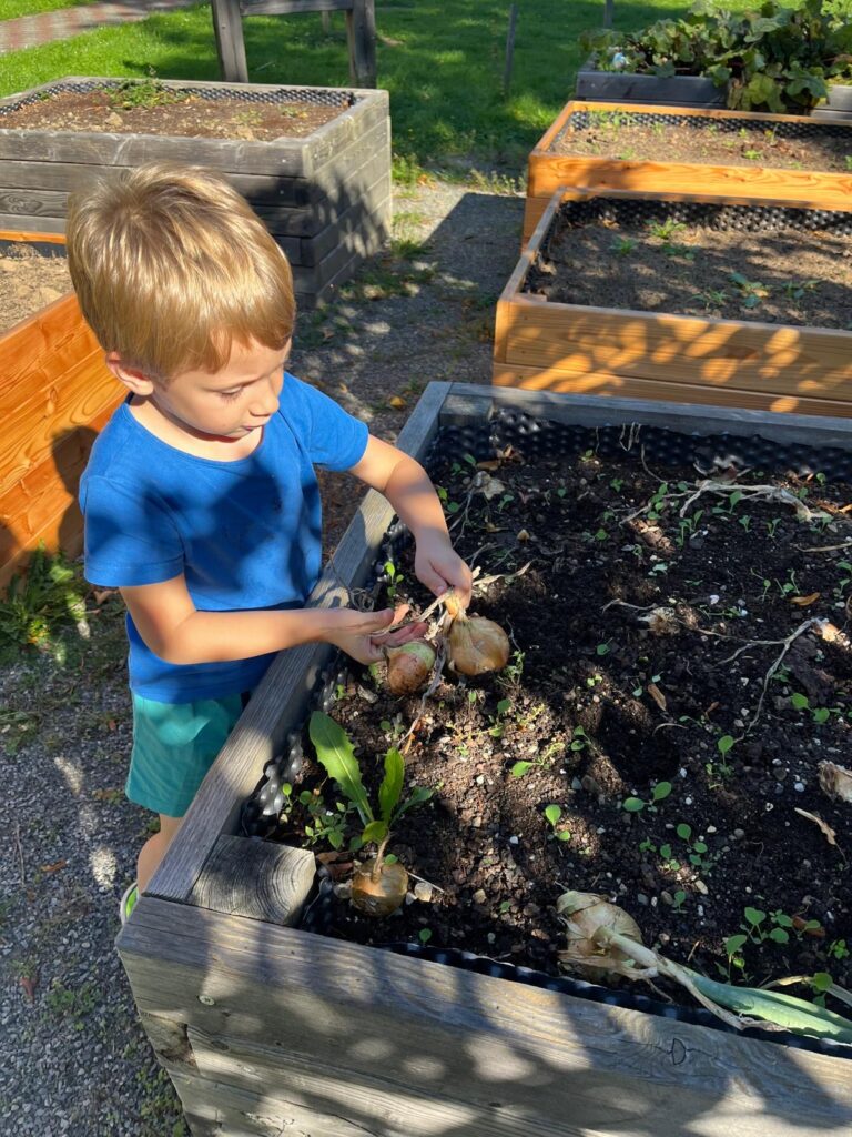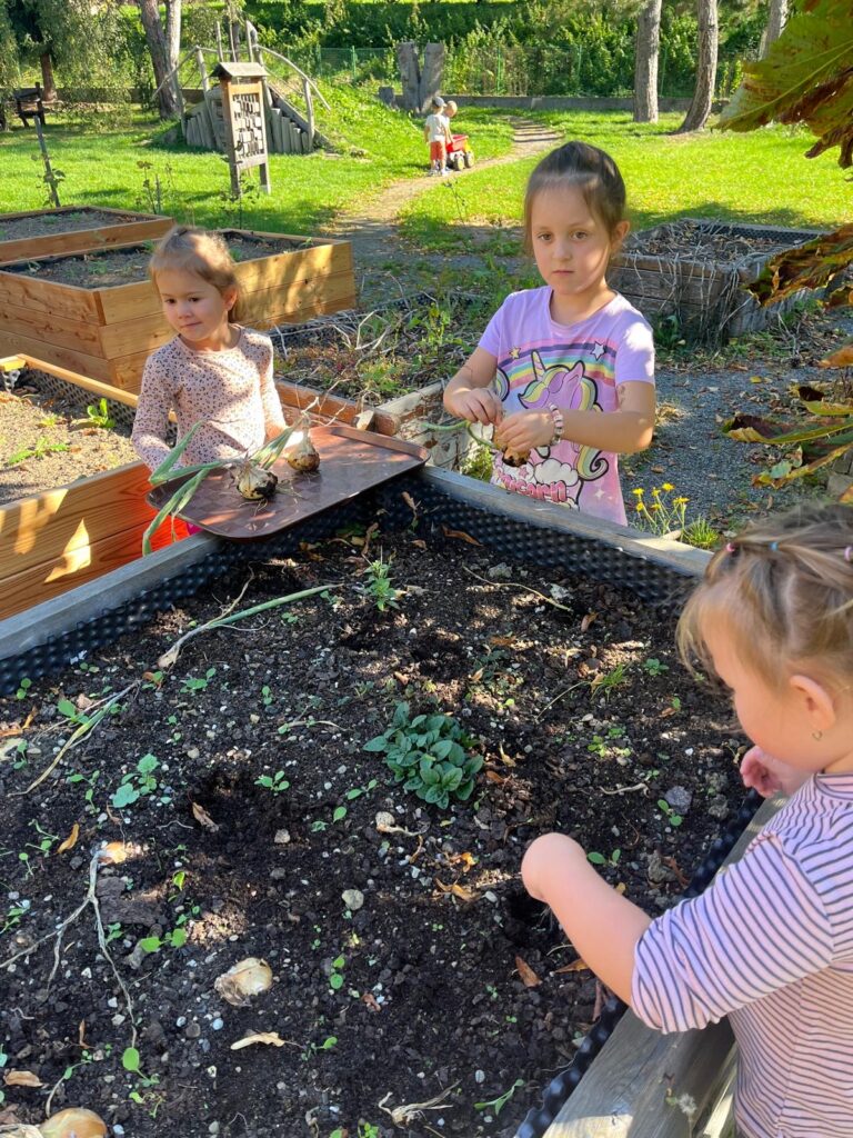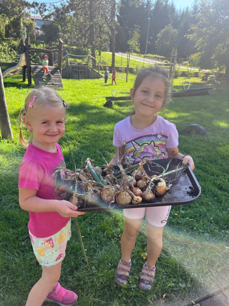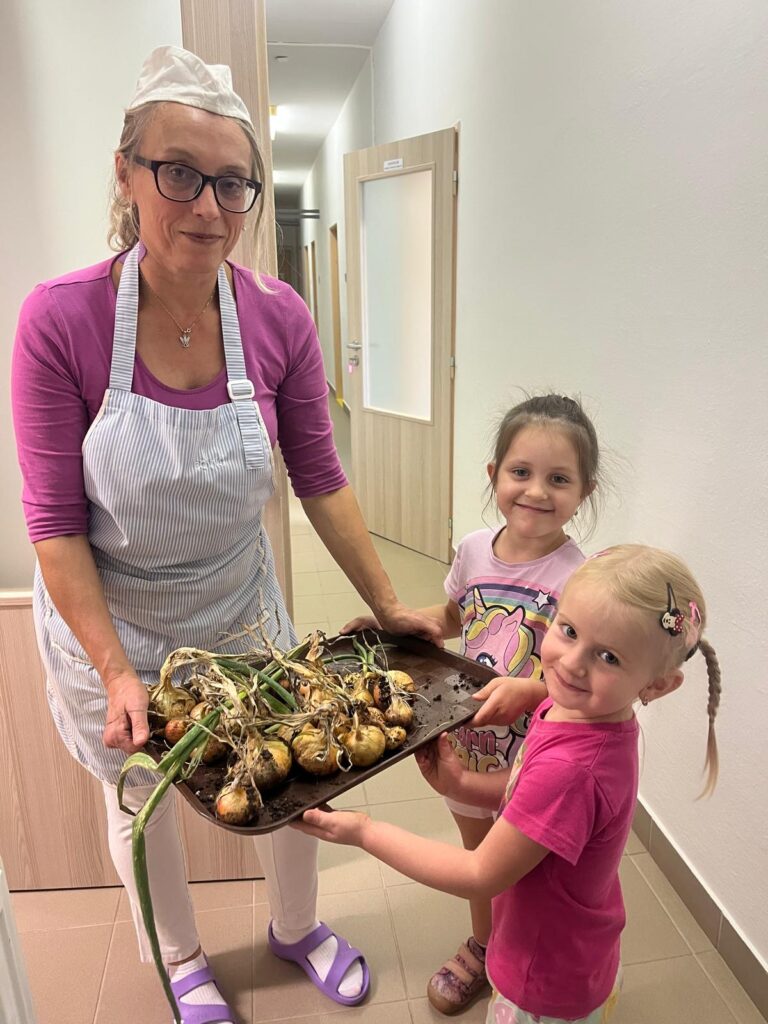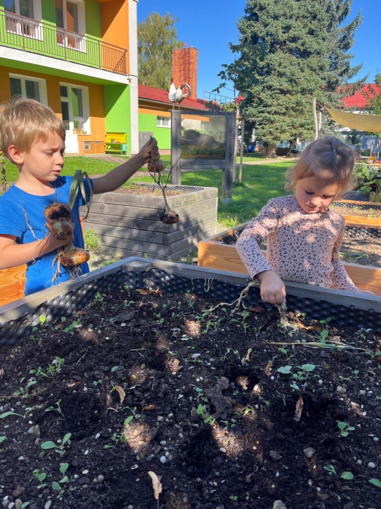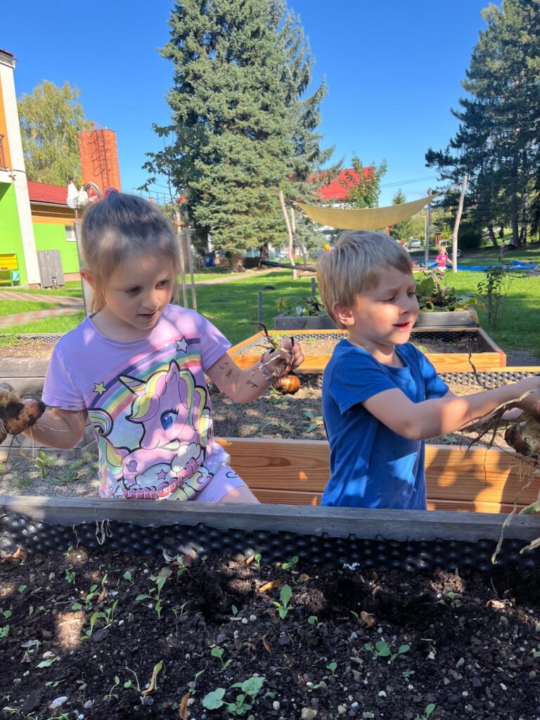 Dnes jsme využili krásného slunečného dne a společně s dětmi jsme se pustili do sklízně cibule z našich vyvýšených záhonků. Děti si práci na zahrádce moc užily a s nadšením pomáhaly vytahovat cibuli ze země. Z naší úrody pak paní kuchařky připraví chutný oběd.