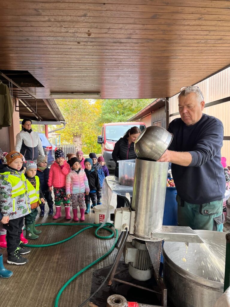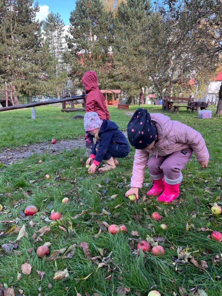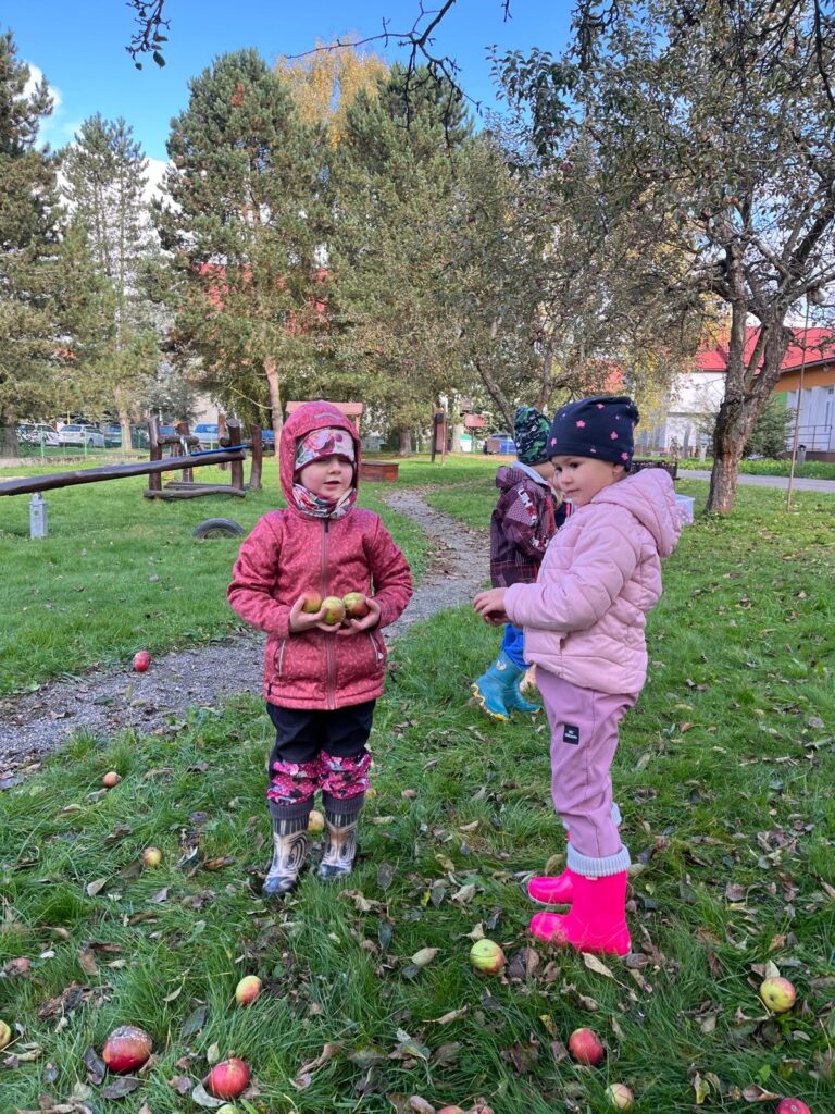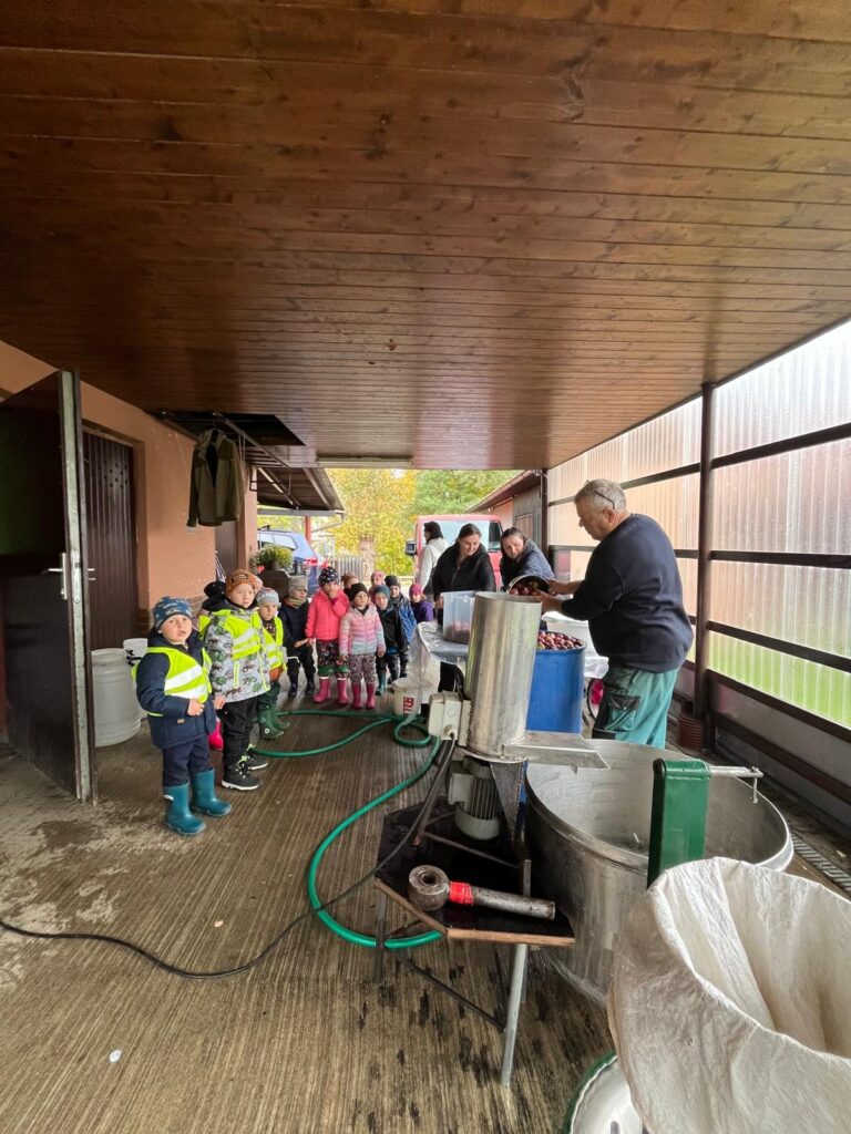 Dnes jsme společně s dětmi obrali jablíčka ze stromu na naší zahradě. Všichni se s nadšením zapojili a brzy jsme měli košíky plné červených a voňavých plodů. Poté jsme se vydali k panu Mužíkovskému, který z našich jablíček lisoval čerstvý mošt. Děti s velkým zájmem sledovaly, jak se z jablek stává voňavý nápoj, a nakonec si mohly mošt i ochutnat. Byl sladký, svěží a všem moc chutnal!