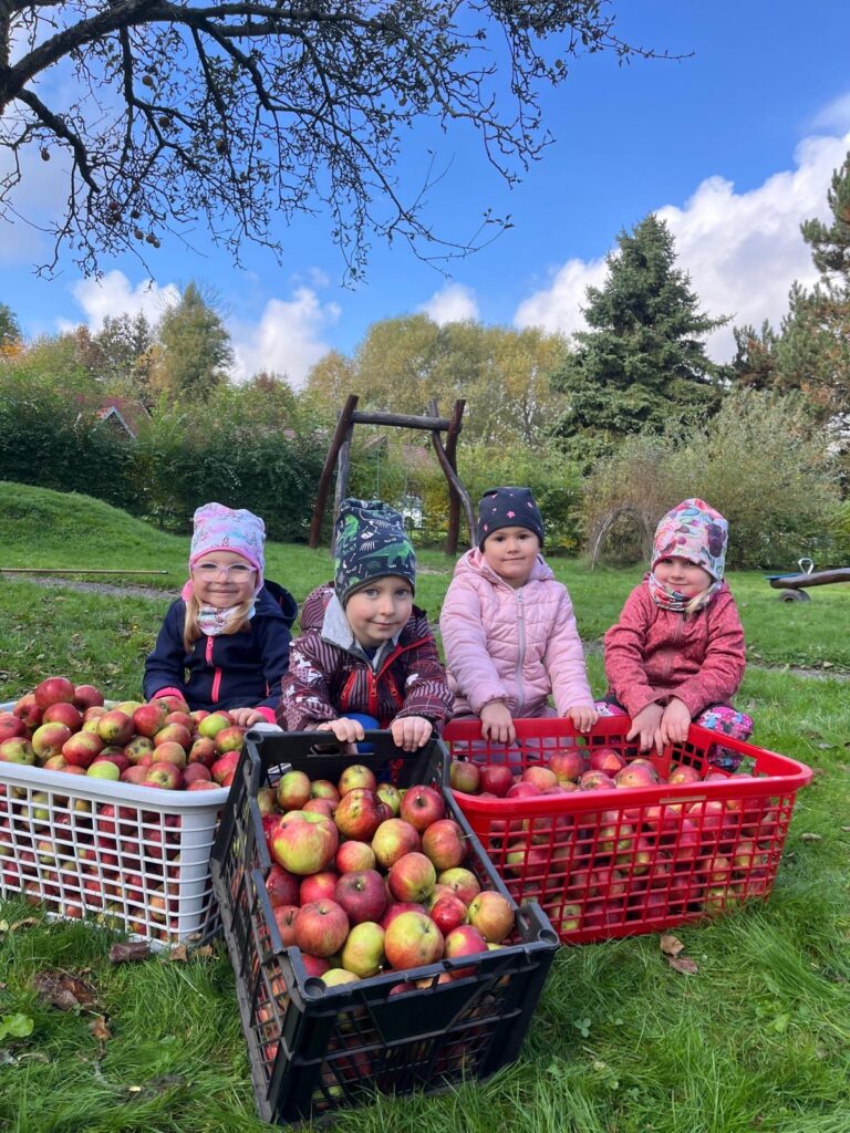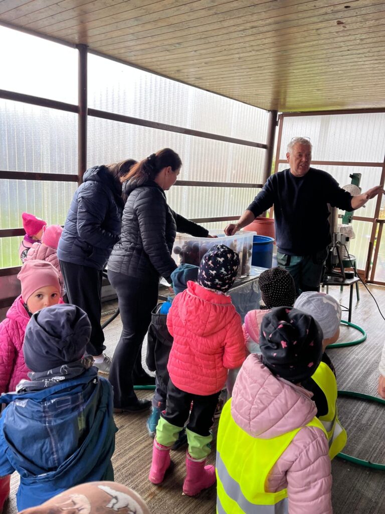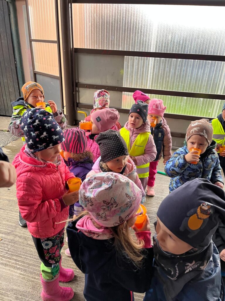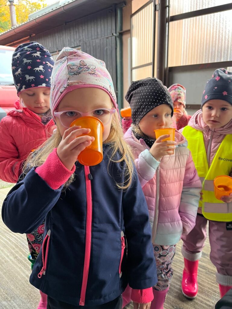 Dnes jsme společně s dětmi obrali jablíčka ze stromu na naší zahradě. Všichni se s nadšením zapojili a brzy jsme měli košíky plné červených a voňavých plodů. Poté jsme se vydali k panu Mužíkovskému, který z našich jablíček lisoval čerstvý mošt. Děti s velkým zájmem sledovaly, jak se z jablek stává voňavý nápoj, a nakonec si mohly mošt i ochutnat. Byl sladký, svěží a všem moc chutnal!